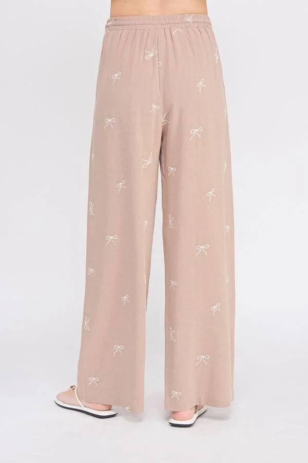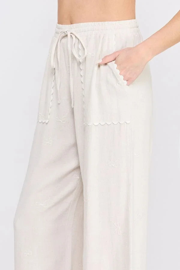 The delicate bow embroidery adds a playful, feminine touch, while the scalloped edges along the trim bring an extra layer of sophistication. Featuring a relaxed wide-leg silhouette and an adjustable drawstring waistband, these pants ensure a flattering fit that moves with you.