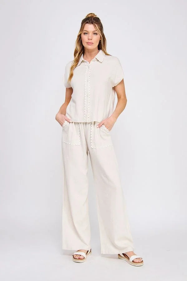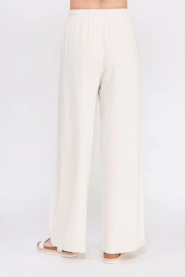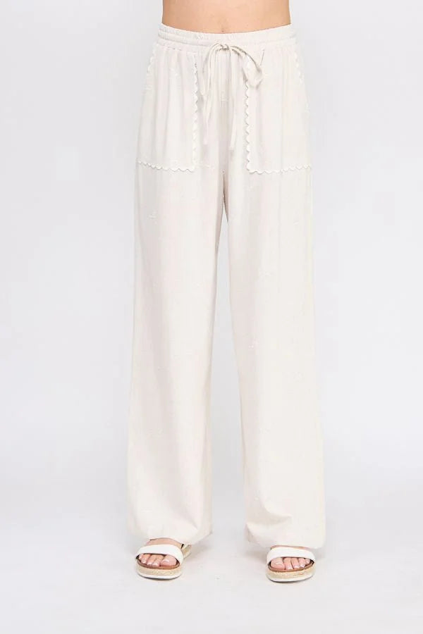 BOW EMBROIDERED LINEN PANTS SCALLOP TRIM