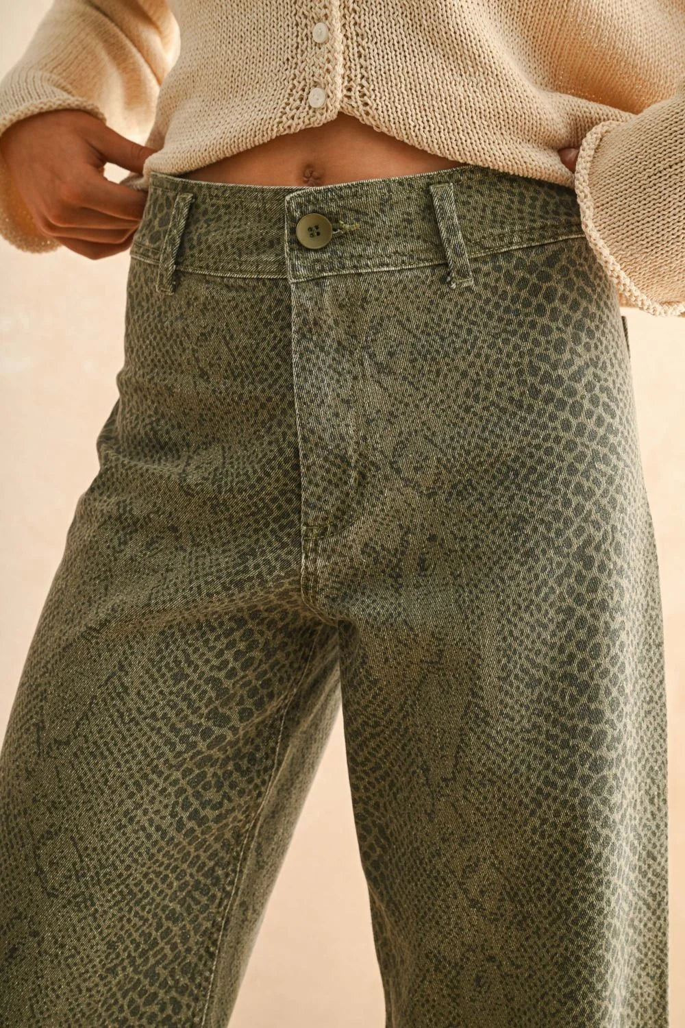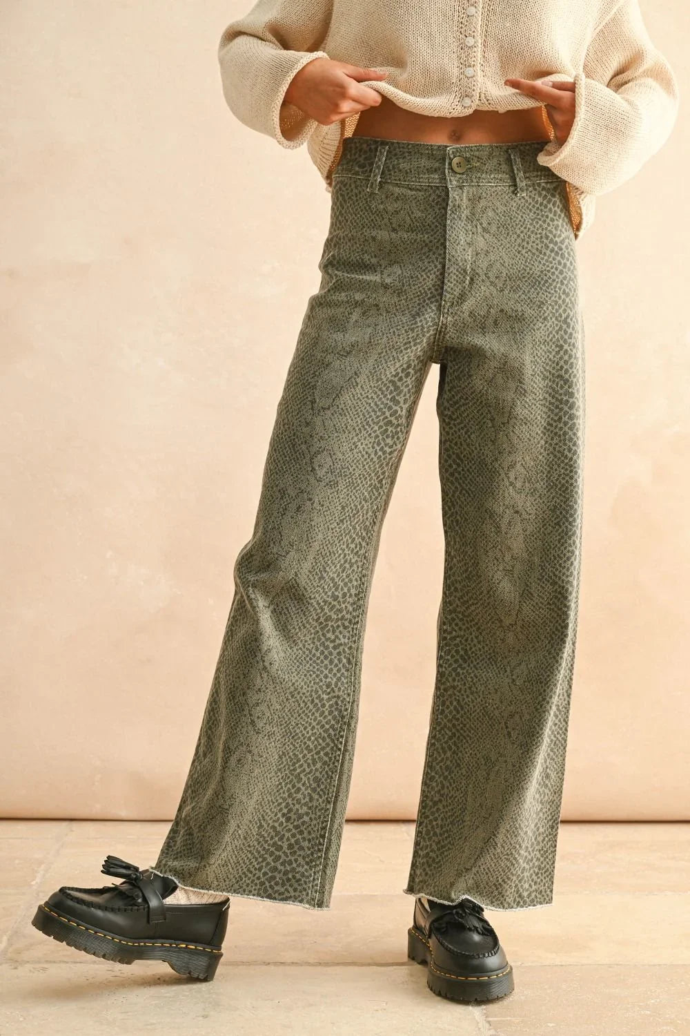 Daisy Lane presents sophisticated snake print pants for the fashion-forward woman. These wide leg bottoms, crafted from a soft cotton blend, offer comfort and style. The snakeskin pattern adds a unique touch to any outfit, making these pants versatile for various occasions. Embrace bohemian chic with these eye-catching, comfortable wide leg pants.