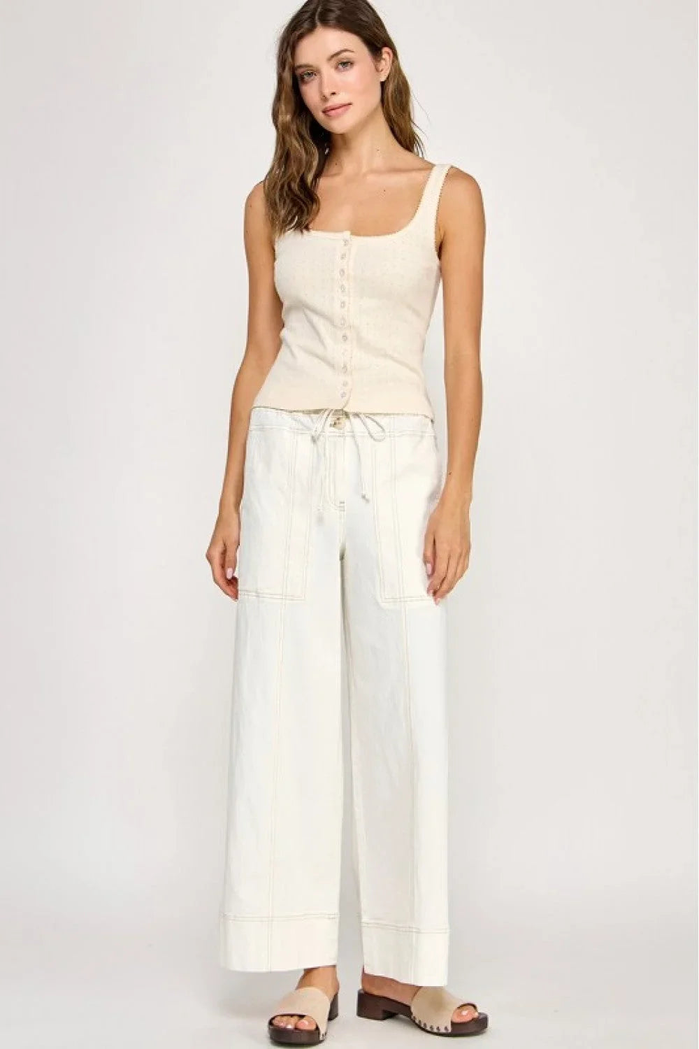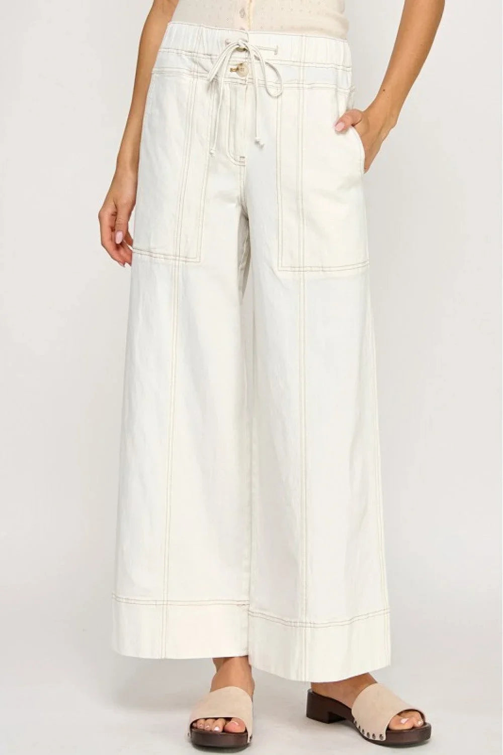 Elevate your style with the effortlessly chic Twill Pull On Wide Leg Pants. Designed for comfort and versatility, these pants feature a relaxed wide-leg silhouette and a flattering high-waisted fit with a drawstring waistband for easy pull-on wear.